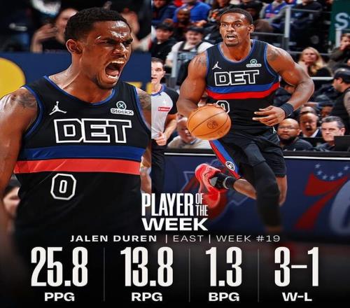 过去一周,杜伦场均25.8分13.8篮板,投篮命中率63.9%,帮助活塞打出3胜1负的战绩。