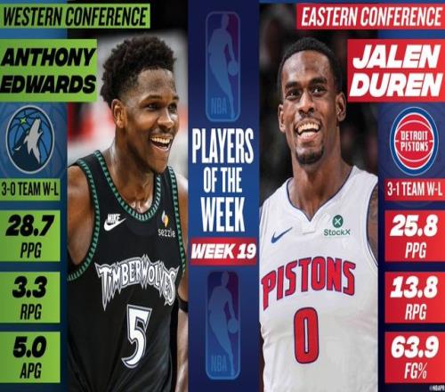 北京时间3月3日,NBA官方公布了第19周的周最佳球员,森林狼的爱德华兹当选西部周最佳球员,这是他本赛季首次当选,也是生涯第三次当选。活塞的杜伦当选东部周最佳球员,这是他生涯首次获得这一奖项。